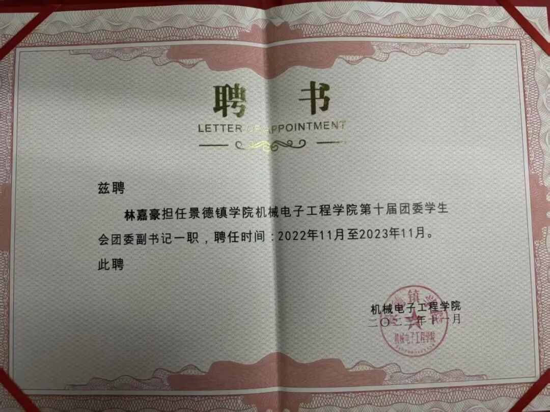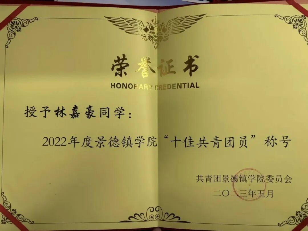(本网讯:图|林家豪/文|胡国庆)优秀毕业生林嘉豪,男,中共党员,景德镇学院机械电子工程学院2025届自动化专业优秀毕业生。曾任景德镇学院机械电子工程学院团委副书记(学生兼职)、景德镇学院烛光社副社长、景德镇学院“青马工程”第十期大学生骨干培训班学员以及21自动化二班团支部书记。曾获“景德镇学院十佳共青团员”“景德镇学院十佳青年志愿者”“优秀团员”“优秀团干部”“返家乡社会实践优秀个人”“免费午餐基金优秀驿站站长”“优秀学生干部”“学生会优秀干事”“家乡优秀志愿者”等多项荣誉。带领班级团支部荣获2022年度五四红旗团支部。积极参与活动竞赛 ,曾获“江西省模拟政协提案三等奖”“校级第四届微团课大赛三等奖”“校级电子设计大赛二等奖”、院级辩论赛二等奖等多项奖项。曾参与2023年战略传播论坛、瓷博会、免费午餐、家乡疫情防控等多项志愿活动。目前就职于广丰区吴村镇人民政府。