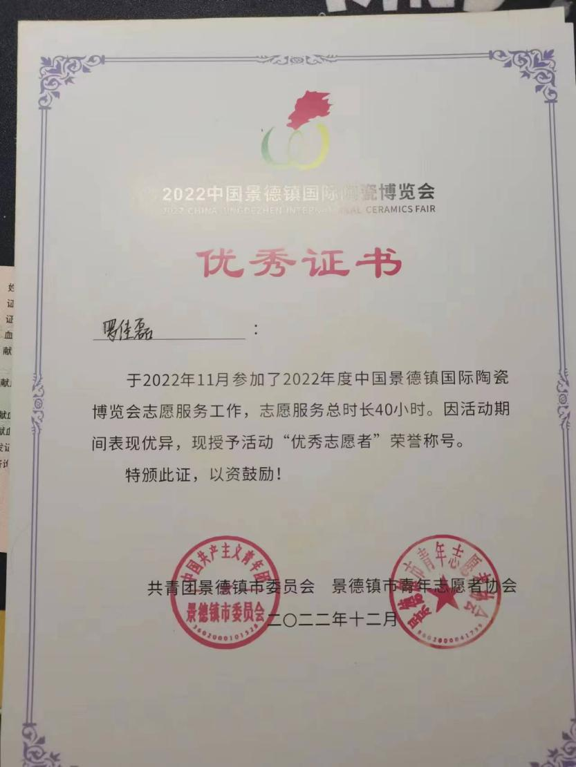 在校期间,他通过长期的职业生涯规划,并结合自身自动化专业特点,树立起稳健务实的创业理念。作为学生会办公室部长,他认真细致、踏实负责,高效完成活动统筹与日常管理工作。在校运动会、新生迎新、无偿献血等志愿服务,以及“中国农民丰收节”、景德镇国际陶瓷博览会等重大活动中,他主动担当、积极奉献,在服务实践中不断成长,深刻体会到奉献的价值与意义。