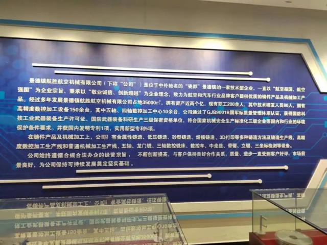 景德镇航胜航空机械有限公司(下称“公司”)是位于中外驰名的“瓷都”景德镇的一家技术型企业,一直以“航空报国、航空强国”为企业宗旨、秉承以“敬业诚信、创新超越”为企业理念,致力为航空和汽车行业品牌客户提供优质的铸件产品及机械加工产品。经过多年发展景德镇航胜航空机械有限公司占地35000平米,拥有资产近两个亿,现有职工200余人,其中技术研发人员80人,拥有高精度数控加工设备150余台,其中五轴、四轴数控加工中心10余台,公司通过了GJB9001B国军标质量管理体系认证,获得国防科技工业武器装备生产许可证、国防武器装备科研生产三级保密资格单位,符合国家机械安全生产标准化三级企业等国内和行业的环境保护条件要求。并获国内发明专利1项,实用新型专利5项。在铸件产品及机械加工上,公司拥有金属性铸造、低压铸造、砂型铸造、熔模铸造、3D打印等多种铸造方法及铸造生产线,高精度数控加工生产线和普通机械加工生产线、五轴、龙门铣、三轴数控铣床、数控车、中走丝、带锯、立锯、三坐标检测等设备。公司始终遵循合规合法办企的经营宗旨,不断创新提高,与客户保持良好合作关系,质量、进步一直受到客户好评,市场前景良好,为公司保持可持续发展奠定坚实基础。