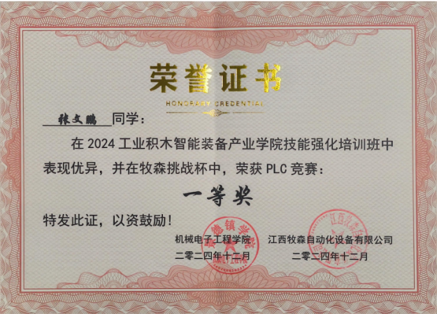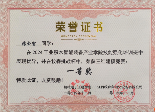 最后结合本次强化培训,学院与牧森集团联合举办《2024年景德镇学院“工业积木”智能装备产业学院首届牧森挑战杯》,最终36名同学获得奖项。