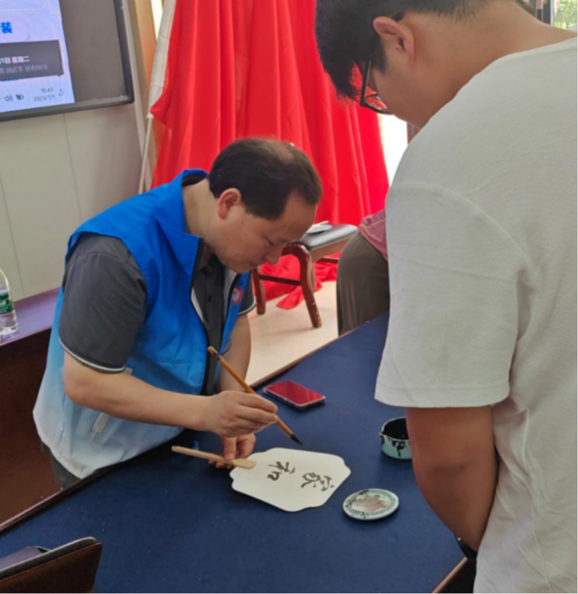 汪开潮老师讲座结束后与其他两位书法专家一同为志愿者以及居民们展示书法,并在书写活动尾声中,实践队成员特邀其中一位书法艺术家题赠墨宝“匠心铸魂”。这幅作品与实践队“匠心筑梦”的精神内核遥相呼应,既是对团队坚守初心的激励,也寄托着深切期许——愿机械电子工程学院“匠心筑梦机电行”文明实践志愿服务队始终以赤子之心践行使命,将理想抱负融入行动,让奋斗之志扎根心间,在服务社会的征程中永葆热忱与担当。