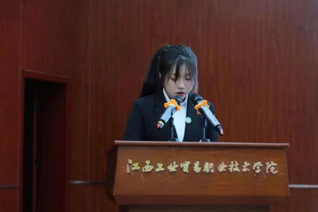 江西工业贸易职业技术学院机电工程系24级机械设计制造及其自动化本科2班代表赵鲜枝发言。她号召同学们要心怀家国、志存高远,励志“家国”情、力行“强国”路。在日常学习中树立学习生涯“小目标”,确立人生规划的“大目标”,在时代坐标中找准青春定位,把个人的小梦想融入国家民族的大梦想,努力走出一条技能成才、技能报国之路。