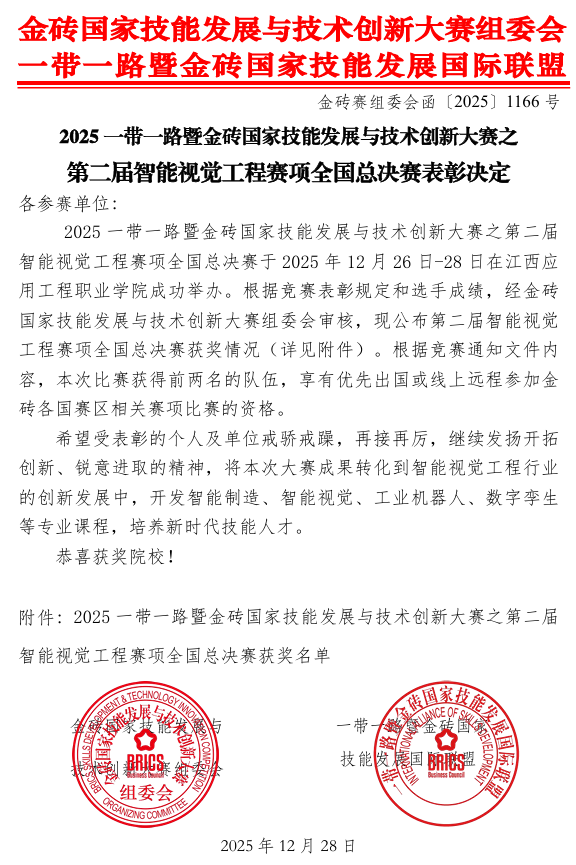 (本网讯:图|胡坤/文|胡坤)2025年12月27日,第二届“一带一路”暨金砖国家智能视觉工程赛项全国总决赛圆满收官。作为教育部备案的84项重量级学科竞赛之一,该赛事聚焦AI前沿技术创新与复合型人才孵化,共吸引全国高校百余支精英战队同台竞技。我院23级自动化2班胡锦宏、程俊威两位同学一路过关斩将,最终揽获全国一等奖一项,再次验证了我院在人工智能与算法方向的育人深度与教学硬核实力。