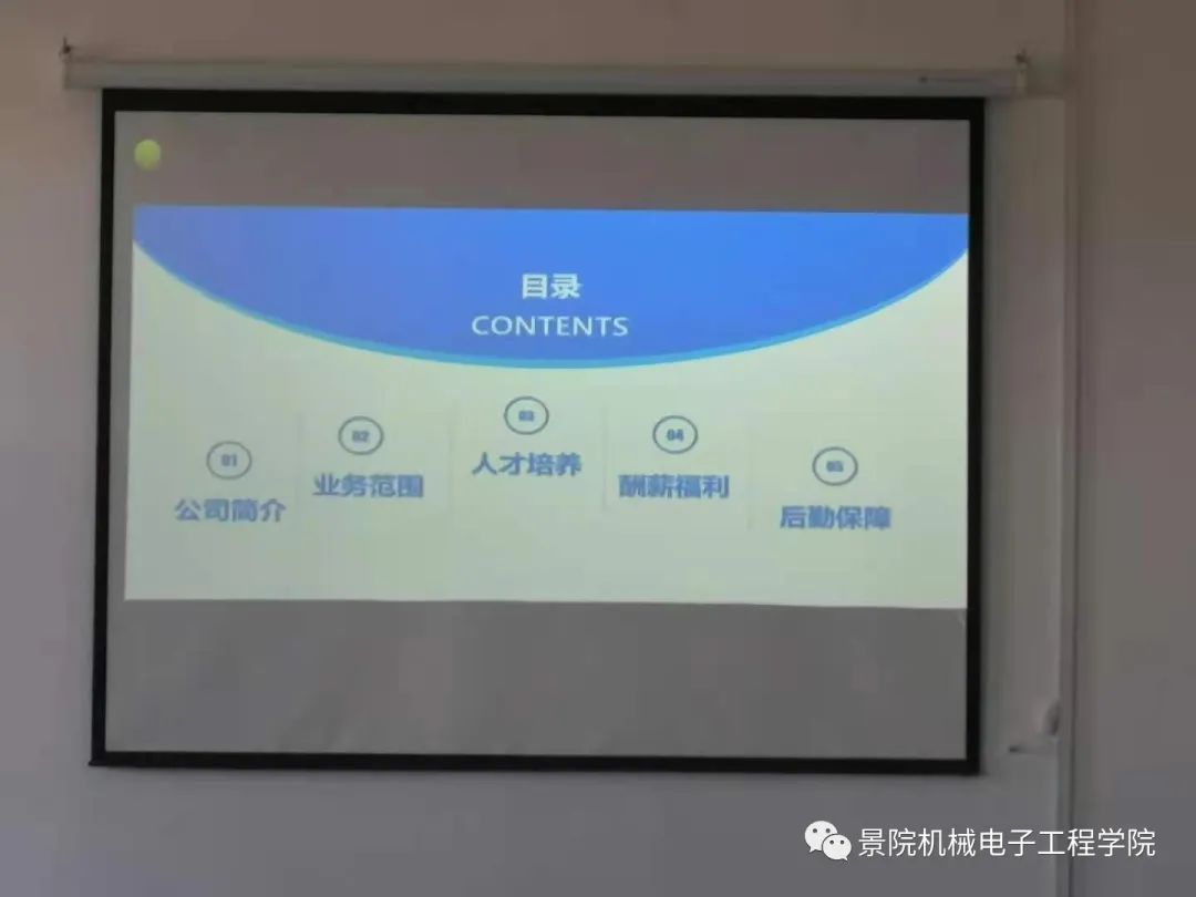 首先,由招聘宣讲人简单介绍了公司简介、业务范围、人才理念、酬薪福利以及后勤保障这五个方面,并阐述了公司的发展前景和产业优势,介绍了公司的招聘、培训、培养人才以及人才方面的投入。